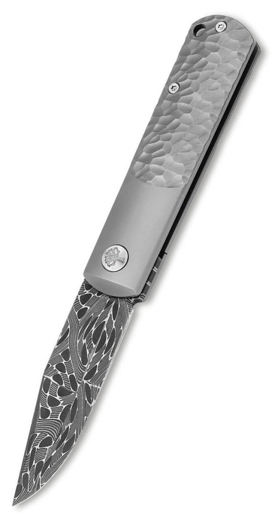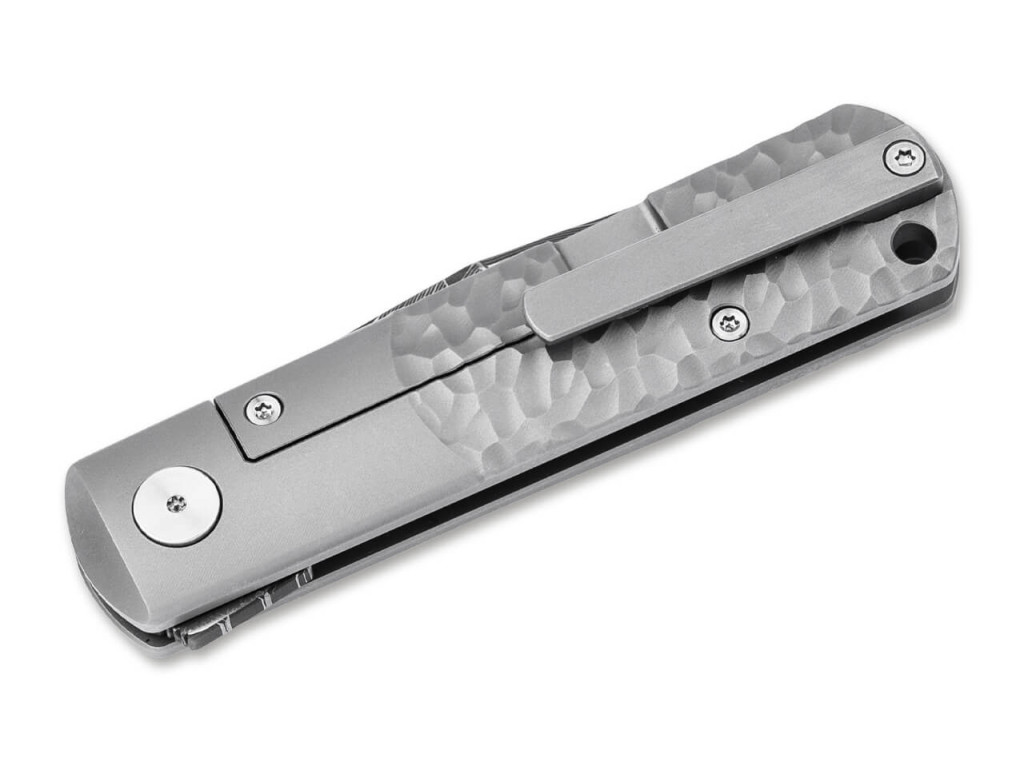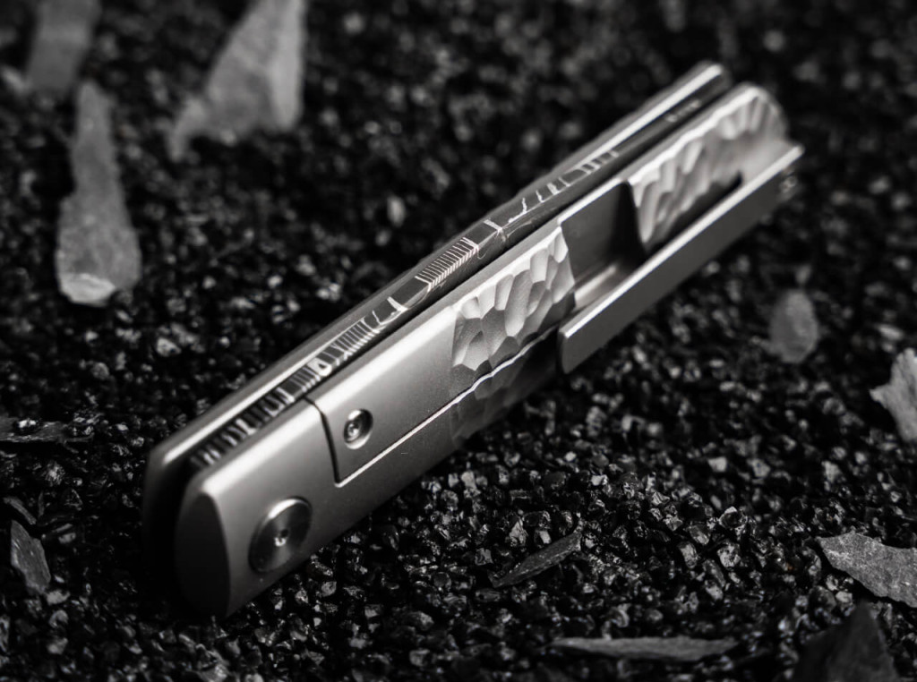 A markolat kialakítása zökkenőmentesen követi a kozmikus tematikát: a precíziósan mart titán markolat optikailag két részre oszlik. Az elülső rész a klasszikus Barlow modellek hosszú bakniját idézi, míg a hátulsó felület a meteoritok jellegzetes, szabálytalan textúráját kapta meg, amely nemcsak esztétikailag lenyűgöző, hanem rendkívül stabil fogást is biztosít. A pengét egy diszkréten integrált Framelock zárszerkezet rögzíti, amely edzett acél betéttel rendelkezik a hosszú élettartam érdekében. A nyitásról egy apró, rejtett flipper gondoskodik, amely nyitott állapotban teljesen eltűnik a markolatban, megőrizve a kés letisztult vonalvezetését. A lapos, mart titán klip (tip-up/r) és a markolat végén található zsinórfurat a kényelmes és elegáns mindennapi hordozhatóságot szolgálja.