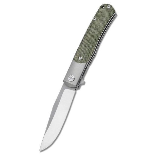 A markolat kialakítása a minimalista luxust tükrözi. Az alapvázat és a biztonságos Frame Lock zárszerkezetet tömör titánból marták ki, ami egyszerre biztosít hihetetlen stabilitást és rendkívül alacsony, mindössze 70 grammos súlyt. A titán vázba illesztett zöld Micarta betétek meleg, texturált fogást adnak, amely az idővel és a használattal egyedi patinát kap. A Frame Lock zár egy acél betéttel is el van látva, ami megakadályozza a titán és az acél penge közötti kopást, így garantálva a zár évtizedekig tartó, pontos működését.