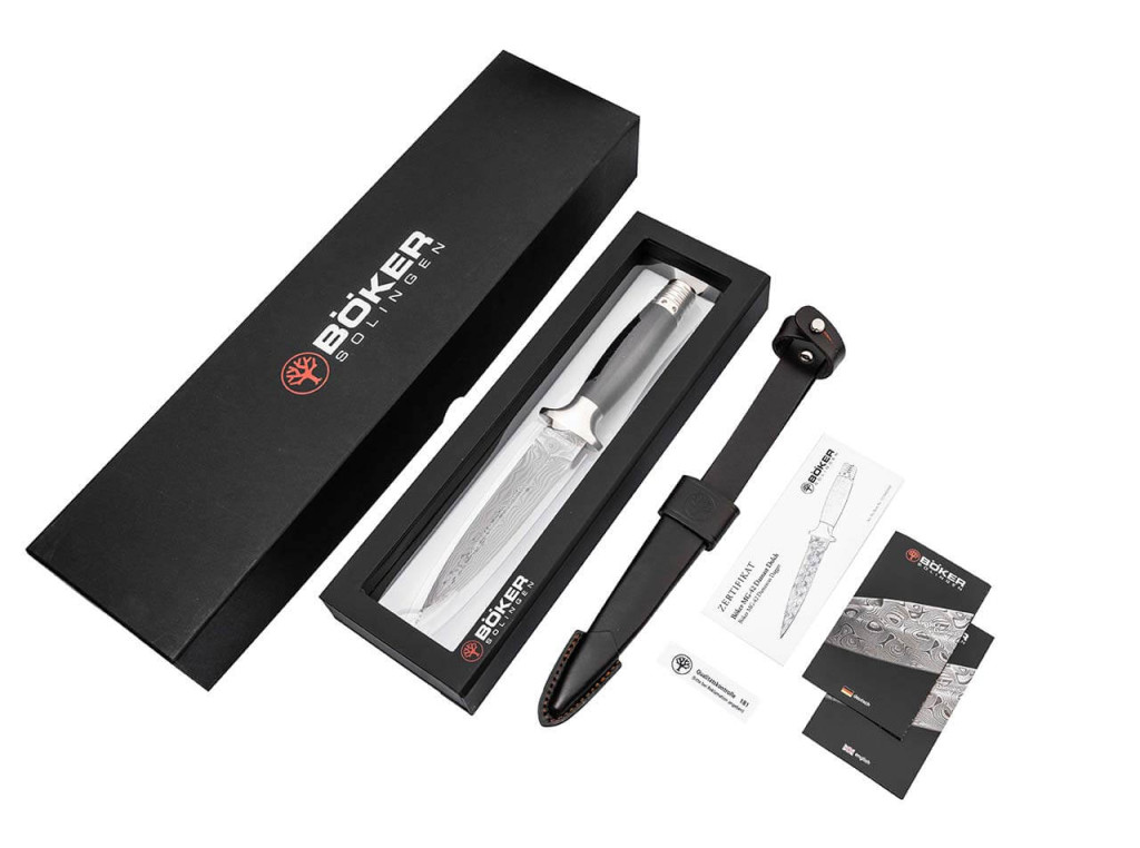 A Böker MG‑42 Damast Dolch teljes hossza 25,4 cm, amely klasszikus tőr‑méretet ad: elegendő hosszúságot ad a penge és a markolat egyensúlyához, miközben hordozás vagy kiállítás szempontjából is impozáns megjelenést kölcsönöz. A pengehossz 13,5 cm, ami elegendő vágó‑ és szúrófelületet biztosít, miközben megőrzi a tőr esztétikailag kiegyensúlyozott arányát. A fixpengés konstrukció miatt nincs zárszerkezet — a penge egyetlen egységet alkot a markolattal, így mechanikailag rendkívül erős és megbízható. A markolat vasfa anyagból készült, amely természetes, csodálatosan erezett felületet ad, és ergonomikusan illeszkedik a kézbe, miközben a masszív rozsdamentes acél elemek (guard és gömbsüveg) a stabil fogást és a vizuális karaktert erősítik. A kés súlya 195 g, ami kiváló kompromisszumot jelent a hordhatóság és struktúra robusztussága között. A készlet tartalmaz egy magas minőségű sötétbarna bőr hüvelyt is övböjttel és megerősített peremmel, amely gondoskodik a kés biztonságos hordásáról és elegáns megjelenéséről. Emellett elegáns díszdoboz, egyedileg számozott hitelesítő okirat és egy keret tartó is jár hozzá, amely különösen alkalmassá teszi gyűjteménybe helyezésre vagy ajándéknak való átadásra.