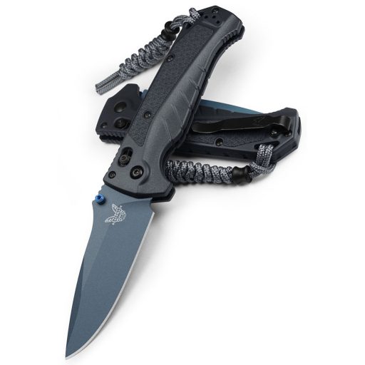A penge anyaga CPM-MagnaCut rozsdamentes porkohászati acél, amelyet 60–62 HRC keménységűre edzenek, így egyszerre biztosít jó éltartást és korrózióállóságot. A drop point formájú penge hossza 98,6 mm, vastagsága 2,9 mm, a felületkezelés pedig kék Cerakote bevonat, amely kopás- és vegyszerálló. A markolat alapja Grivory, egy üvegszál-erősített polimer, amely egyszerre könnyű és ellenálló; színe Tempest Gray, felülete texturált. A penge nyitása kétoldali thumb stud segítségével történik, a zár AXIS® típusú, rugós rendszerrel, amely biztonságos zárást kínál, miközben gyorsan oldható, bal- és jobbkezes működtetésre egyaránt alkalmas. A mélyen ülő, tip-up zsebklipsz stabilan tartja a kést zsebben vagy felszerelésen, és mindkét oldalra átszerelhető, a használói szokásoknak megfelelően.