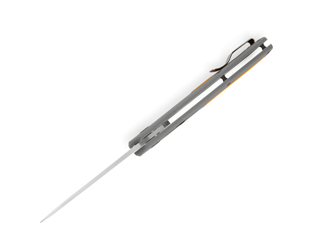 A kés teljes hossza 215 mm, zárt állapotban 130 mm, a penge hossza 85 mm, vastagsága 3 mm. Az anyaghasználat 7Cr17MoV rozsdamentes acél: ez egy gyakorlatias és tartós választás, jó kopásállósággal és éltartással. A penge forma drop point – ideális formát ad mindennapi feladatokra. A markolat injektált műanyag, textúrázott felülettel, amely csúszásbiztos fogást garantál. A kés súlya 122 g, ami kényelmessé teszi a hosszantartó hordást. A leesést és véletlen nyitást a button lock zárgomb biztosan megakadályozza.