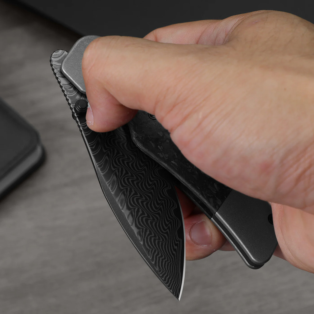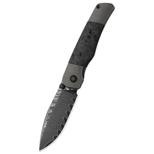 A penge alapanyaga a látványos Damascus acél, amely egyedi, rétegelt mintázatával és kiváló vágási tulajdonságaival tűnik ki. A felületkezelés során acid-washed (savval maratott) eljárást alkalmaztak, amely sötétebb tónust ad az acélnak, és segít elrejteni a használat során keletkező apró karcokat. A penge keménysége 60-62 HRC (a Rockwell-skálán mért keménységi érték), ami biztosítja a tartós éltartást és a kopásállóságot a mindennapi feladatok elvégzésekor. A Drop Point kialakítás (olyan pengeforma, ahol a hátvonal enyhén domborodik a hegy felé) sokoldalú használatot tesz lehetővé, legyen szó finom vágásokról vagy általános célú munkáról. A Flat grind (lapos leélezés, ahol a penge vastagsága egyenletesen csökken a hátoldaltól az él felé) optimális vágási hatékonyságot biztosít, így a penge könnyedén hatol át az anyagokon. A 77 mm pengehossz pontosan az a méret, amely még jól kontrollálható, de már elegendő vágófelületet kínál a hatékony munkavégzéshez. A 2,8 mm vastagságú penge merev és ellenálló marad terhelés alatt is.