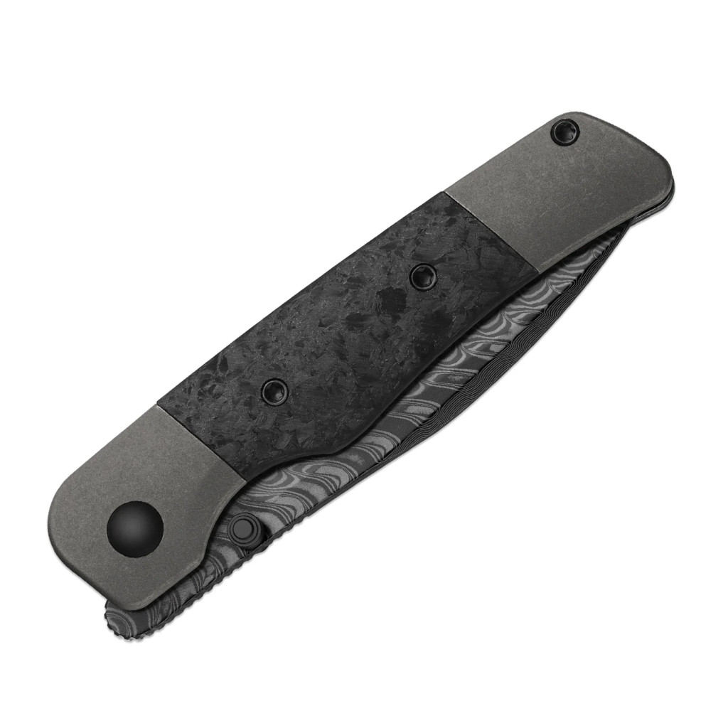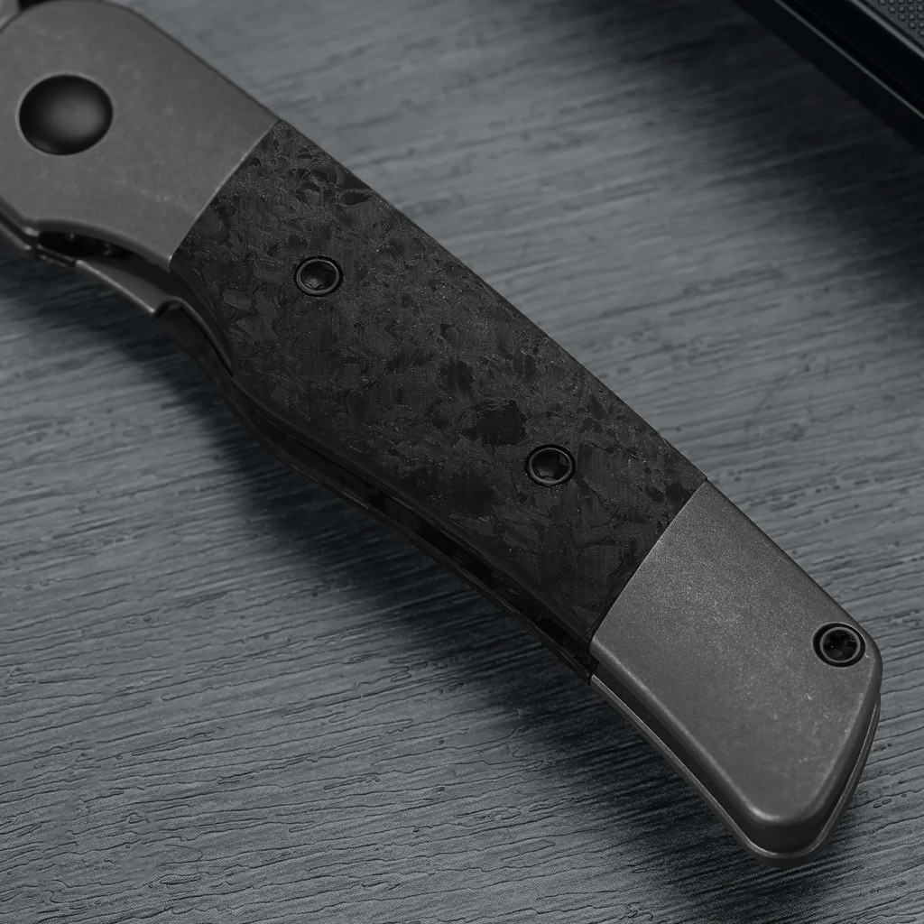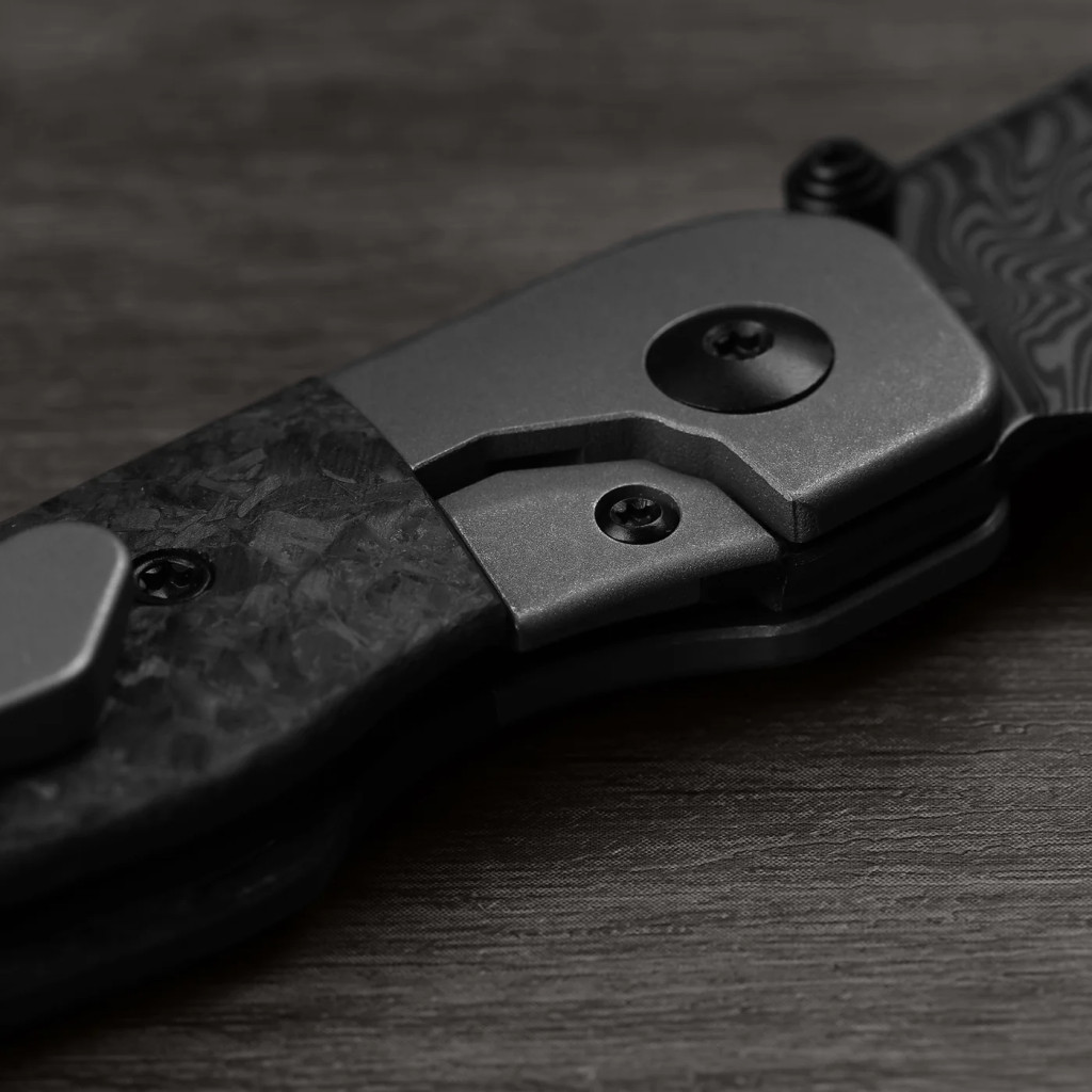 A markolat szerkezete a tartósság és a kis súly jegyében titán vázra épül, amelyet exkluzív szénszál (Carbon Fiber - nagy szilárdságú, könnyű kompozit anyag) betétekkel tettek még ellenállóbbá. A Frame Lock (keretzár) mechanizmus a markolat részét képező masszív fémlapot használja a penge rögzítésére, amely nyitott állapotban stabilan tartja az élt, megakadályozva a véletlen becsukódást. A nyitásról a pengén elhelyezett thumb stud (egy kisméretű, ujjra illeszkedő fém szem) gondoskodik, amely lehetővé teszi a gyors és egykezes használatot a hüvelykujj segítségével. A tervező, Derek Sharon, a double bolster (kettős baknis) stílust alkalmazta, ahol a markolat elején és végén látható titán elemek vizuális egyensúlyt teremtenek a szénszál betétekkel. Az ergonómiailag formázott titán markolat kényelmes fogást biztosít hosszabb ideig tartó használat esetén is, a 103 mm markolathossz pedig elegendő helyet kínál a biztonságos kézben tartáshoz minden tenyérméret esetén.