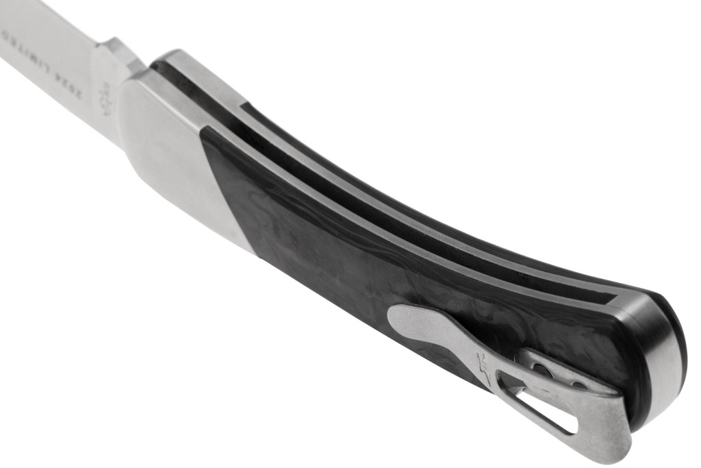 A penge anyaga CPM S30V, amelyet a gyártó a Limitált Széria egyik fő jellemzőjeként jelöl meg: nagy él-tartás, korrózióállóság és megbízhatóság jellemzi. A penge clip-point kialakítású, sima élkiképzéssel, ami jól használható mindennapi feladatokra, előkészítő vágásokra, csomagbontásra vagy precíz irányítást igénylő feladatokra. A markolat különleges szénszál (carbon fiber) betétekkel készül, melyek a fém betétekkel és a polírozott elemekkel együtt nemcsak látványosak, hanem könnyű és merev szerkezetet biztosítanak. A zármechanizmus backlock, amely a klasszikus Buck-tradíciót követi, stabil rögzítést ad, és a penge véletlen záródását megbízhatóan akadályozza meg. A modell korlátozott darabszámban készült, egyedi sorszámozással, így esztétikai értéke legalább annyira jelentős, mint használati oldalról.