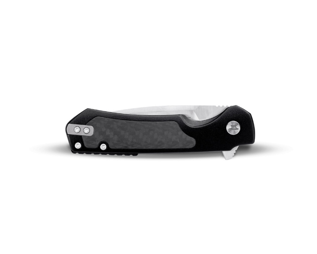 A markolat anodizált alumíniumból készül, amely könnyű és ellenálló, felületén karbonszálas betéttel a modern esztétika és fokozott tartósság érdekében. A penge D2 szerszámacélból készült, amely nagy kopásállóságot és hosszú éltartást biztosít. A drop point pengeforma (enyhén lejtő hegy, sokoldalúan használható vágásoknál és szúrásoknál) a mindennapi használat egyik legkedveltebb kialakítása. A nyitás blade flipper mechanizmussal történik (pengetőnél elhelyezett nyúlvány, amely gyors, egykezes nyitást tesz lehetővé). A zár frame lock (a markolat egyik oldallemeze reteszeli a pengét, biztosítva a stabilitást és biztonságot). A markolat hátulján deep carry (mélyen ülő) övcsipesz található, amely diszkrét hordást biztosít, ráadásul reversible kialakítású (jobb- és balkezes használathoz is átfordítható). A penge hátán jimping (finom recézés) segíti a biztos fogást.