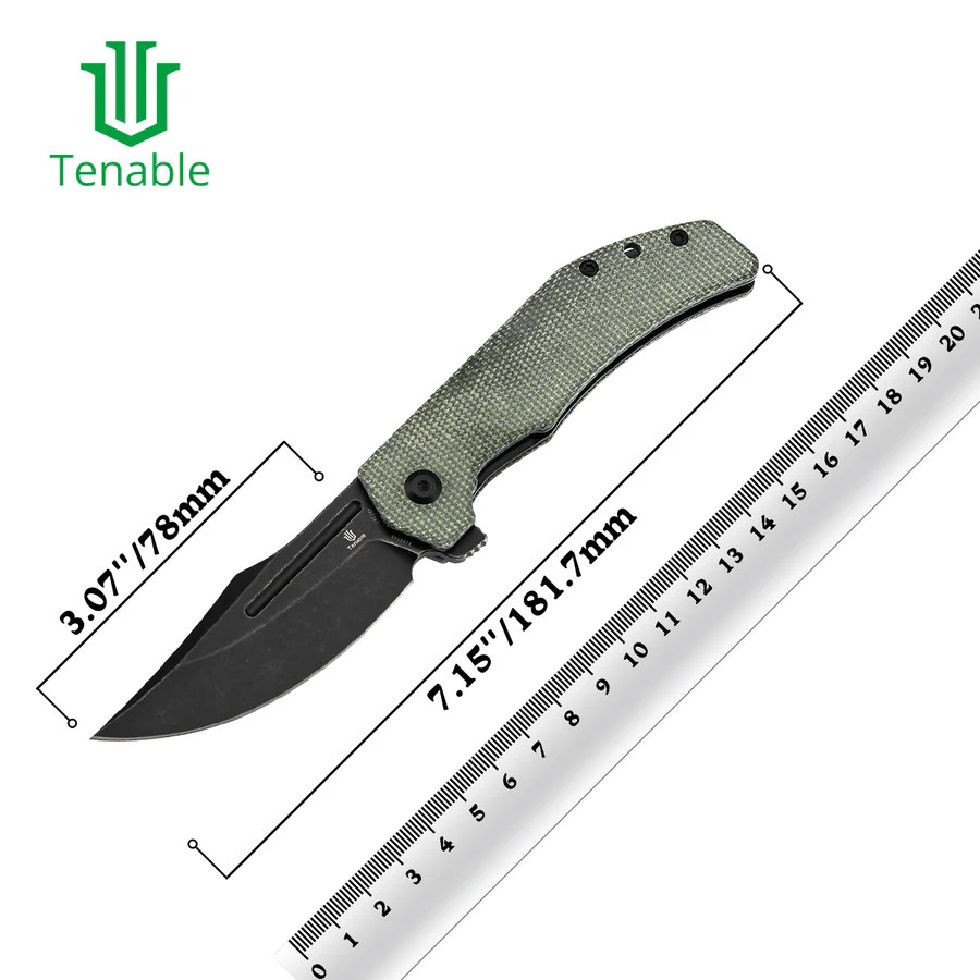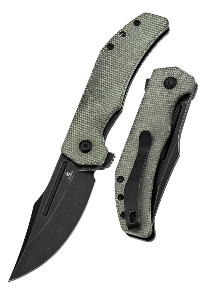 Ez a modell kiegyensúlyozott méretet és korszerű konstrukciót kínál: a penge anyaga 14C28N rozsdamentes acél, mely jó korrózióállósággal és viszonylag könnyű élezhetőséggel rendelkezik. A pengének „clip point” (vágásra optimalizált hegyesített) formája, valamint a részben „fuller” (vágófogással kiegészített) kivágása segíti a hatékony használatot. A markolat anyaga zöld Micarta, amely rétegezett kompozitként magas mechanikai szilárdságot biztosít, stabil fogást ad, és hordás közben is jól viseli a kopást. A nyitás flipper tabbal történik, kerámia golyóscsapágyas rendszerrel, ami sima, gyors pengemozgást tesz lehetővé. A zármegoldás liner lock típusú, ami egyszerű és megbízható működést kínál. A zsebklip „mély-hordható” (deep-carry) kialakítású, a jobb- és balkezes hordást is támogatva.