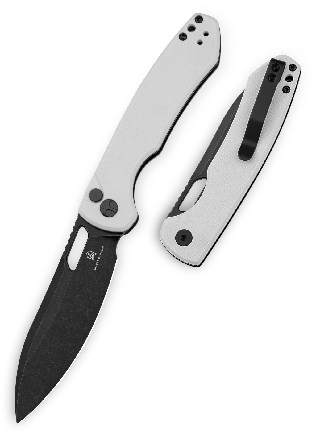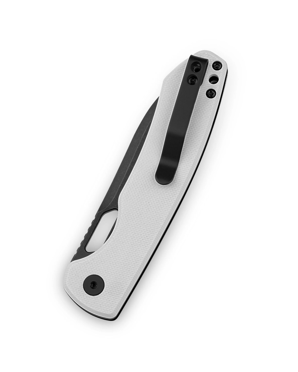 A BMK05E a forgópontjainál gondosan kialakított, egyszerű, mégis jól használható formát képviseli. A penge mindkét oldalán megtalálható a nyithatóságot biztosító kivágás, a zármechanizmus pedig gombzár (button lock) típusú — így a használat gyors és biztonságos. A markolat az ismert G10 laminátumból készült, fehér kivitelben, amely erős fogást és tartósságot kínál még akkor is, ha a kéz nedves vagy hideg. A zsebklip mélyen hordható kivitelű, ambidex-barát (jobb- és balkezes viseléshez egyaránt) kialakítással — ez azt jelenti, hogy a hordás praktikus és zökkenőmentes marad. A pengén alkalmazott felületkezelt bevonat kombinációja a letisztult megjelenést támogatja, ugyanakkor visszafogottan kezeli a használat nyomait is.