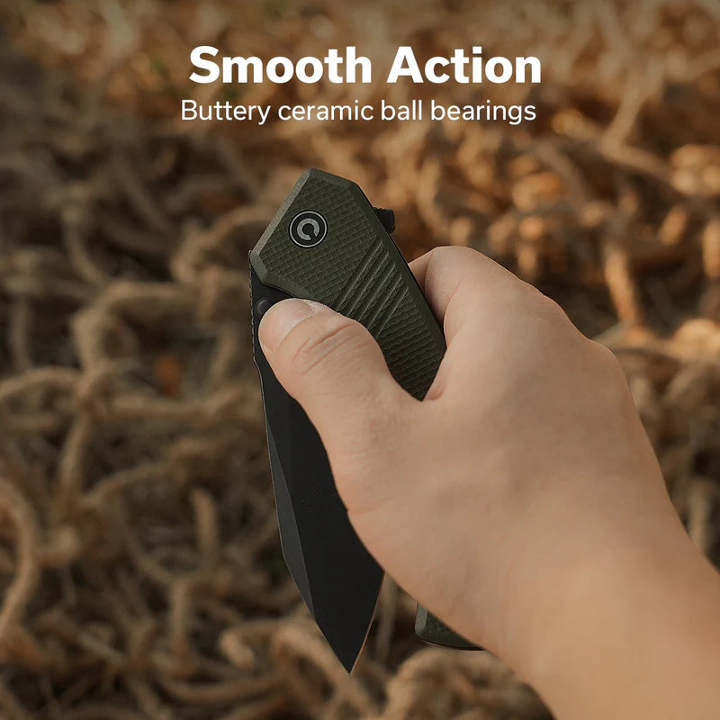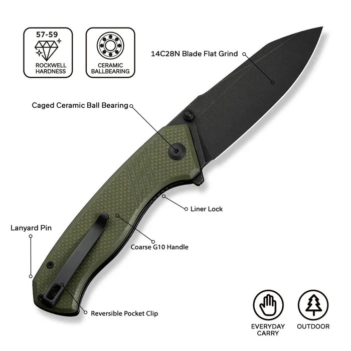 A bicska markolata OD Green Coarse G-10 (nagy nyomáson préselt, üvegszálas műgyanta kompozit, amely rendkívül ellenálló a nedvességgel, vegyszerekkel és mechanikai behatásokkal szemben) panelekből épül fel. A „Coarse” jelölés a durva textúrára utal, amely garantálja, hogy a kés nedves vagy kesztyűs kézzel történő használat során se csússzon meg, növelve ezzel a biztonságot. A belső váz stainless steel liners (rozsdamentes acél vázlemezek, amelyek a markolatpanelek között helyezkednek el, és a kés szerkezeti merevítését adják) elemekre épül, amelyek fekete felületkezelést kaptak az egységes megjelenés érdekében. A penge rögzítéséért a Liner Lock (egy belső, rugalmas acéllemez, amely nyitott állapotban a penge mögé ugrik, megakadályozva a véletlen becsukódást) mechanizmus felel. A markolatban található G10 backspacer (távtartó elem a markolat háti részén) tovább növeli az eszköz szerkezeti stabilitását, biztosítva a hosszú élettartamot még intenzív igénybevétel mellett is.