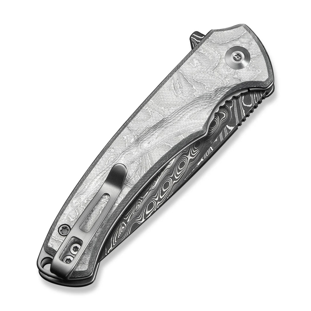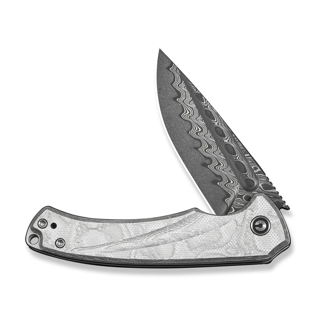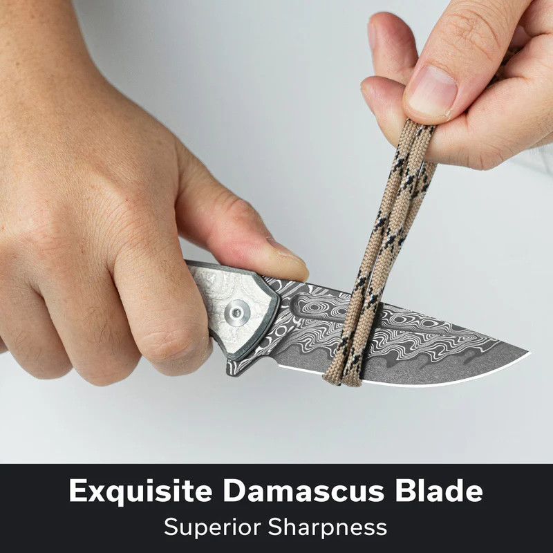 A bicska legfontosabb alkotóeleme a lenyűgöző Damascus steel (többrétegű, kovácsolt acél, amely az egyedi mintázatáról és kiváló mechanikai stabilitásáról ismert) penge, amely 58-60 HRC (Rockwell-keménységi skála, amely az anyag szívósságát és éltartását jelzi) keménységével garantálja a hosszan tartó élességet. A Drop Point (a penge háta fokozatosan ível lefelé a hegy irányába, ami rendkívüli sokoldalúságot és stabillá teszi a vágási feladatoknál) pengeprofil 74 milliméteres hosszúsággal és 3,0 milliméteres vastagsággal rendelkezik, biztosítva a szerkezeti stabilitást a legkülönfélébb feladatok során is. A penge felülete speciális Black Hand Rubbed (kézzel dörzsölt fekete felületkezelés, amely kiemeli a damaszkolt acél rétegeit és egyedi, sötét tónust kölcsönöz neki) finiselést kapott, amelyhez Hollow grind (homorú leélezés, amely rendkívül vékony és éles vágóélt tesz lehetővé) profil társul, maximalizálva a metszési hatékonyságot. A pengén található stílusos fuller (a penge síkjába mart hosszanti horony, amely súlycsökkentésre és esztétikai célokra szolgál) tovább erősíti a kés futurisztikus karakterét, miközben megkönnyíti a manuális nyitást is.
