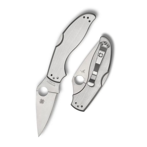 A penge anyaga 8Cr13MoV rozsdamentes acél, amely jól ismert a kiegyensúlyozott tulajdonságairól: megfelelő élmegtartást, egyszerű élezhetőséget és megbízható korrózióállóságot biztosít. A penge drop point formájú, amely erős hegyet és hosszú, sokoldalúan használható vágóélt kínál. A felületkezelés satin, vagyis selyemfényű polírozás, amely elegáns, ugyanakkor a használat során kevésbé látszanak meg rajta az apróbb karcolások. Az élezés full-flat grind, teljes lapos köszörülés, amely precíz vágást biztosít és csökkenti a vágási ellenállást. A markolat teljes egészében rozsdamentes acélból készült, amely erős és tartós szerkezetet ad a késnek. A nyitás a Spyderco ikonikus Round Hole hüvelykujjas nyílásával történik, a biztos és stabil záródást pedig a jól bevált Back Lock zárszerkezet garantálja. A hordhatóságot egy négyállású zsebcsíptető egészíti ki, amely lehetővé teszi a jobb- vagy balkezes, heggyel felfelé vagy lefelé irányuló hordást.