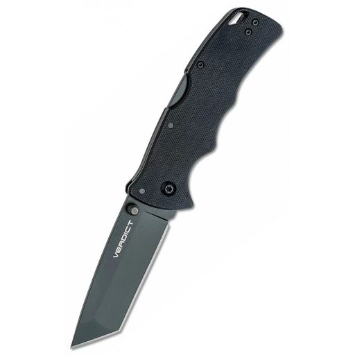 COLD STEEL Verdict AllBlack Tanto bicska könnyű, könnyen nyitható, és Tri-Ad® lock zárral szerelt zsebkés, melynek a pengéje a fekete csillogásmentes AUS10A acél agresszív tanto heggyel. Markolata G-10 melyet évekig tartó kemény használatra terveztek. Viselését mélyen ülő zsebklipsz segíti elő mely átszerelhető.