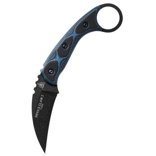 TOPS Devils Claw 2 kompakt taktikai kés mely kiválóan alkalmas diszkrét viseléshez. Full tang felépítésű penge 1095 magas széntartalmú acélból készült, mely egy fekete bevonatot kapott elsősorban korrozió való védelem érdekében de rejtés szempontjából sem utolsó. Markolata fekete-kék mintázatú G-10. Viselését a hozzá adott kydex tokkal oldhatjuk meg.