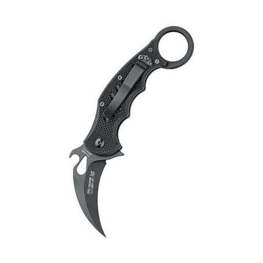Fox kisméretű karambitja. Penége N690 és a fekete bevonatot kapott. Markolata fekete. igen érdes felületű G-10. Pengéjét a véletlen záródás ellen keresztzár rögzíti. Flipper.. emerson wave és nyitólyuk segítségével is nyitható. Klipsze átszerelhető. Hegy fenn állásban jobb és balkezesek is hordhatják.