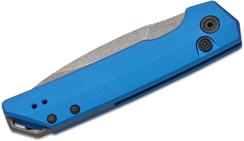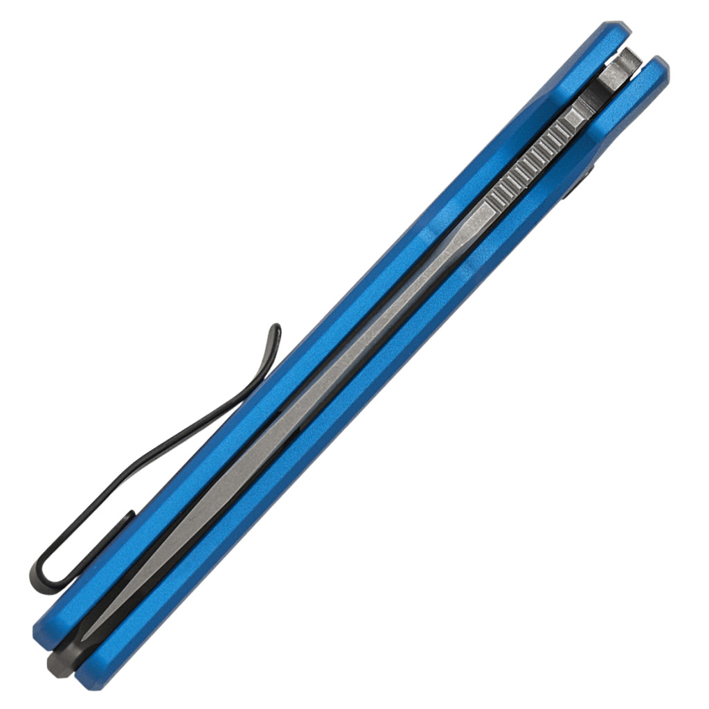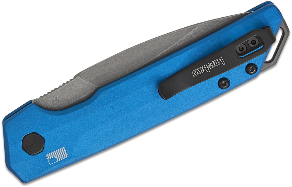 Ez a modell az automata nyitás kényelmét kínálja, amelyet a markolat oldalán található gomb vezérel. A button lock (gombzár) megbízhatóan rögzíti a pengét, legyen az nyitva vagy zárva, így használata biztonságos és egyszerű. A markolat anodizált alumíniumból készült, amely könnyű, mégis tartós, felülete kék színű, elegáns és modern hatást kelt. Az ergonomikus forma biztos fogást ad, miközben hosszabb használat közben is kényelmes marad. A hordozást mélyen ülő, kétoldalról áthelyezhető tip-up klip teszi praktikussá, amely mind jobb-, mind balkezesek számára ideális. A kés zárt állapotban mindössze 105 mm, így zsebben hordva szinte észrevétlen, de egyetlen mozdulattal előhívható, amikor szükség van rá.