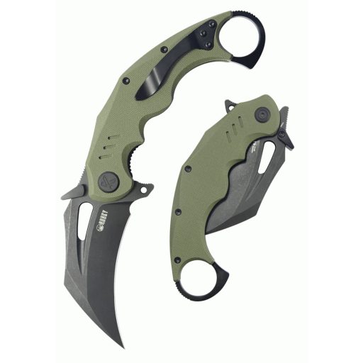 A penge 14C28N rozsdamentes acélból készült, amelyet vákuumos és kriogén hőkezeléssel edzettek. (A vákuumos edzés során oxigénmentes környezetben hevítik az acélt, hogy tisztább, homogénebb szerkezetet kapjon; a kriogén kezelés pedig extrém alacsony hőmérsékleten stabilizálja az anyagot, javítva az élmegtartást.) Ennek eredménye a 60–62 HRC keménység, ami azt jelenti, hogy a penge hosszú ideig éles marad. A penge formája karambit, vagyis erősen ívelt, karmot idéző kialakítás, amely kontrollált, erőteljes húzóvágásokat tesz lehetővé. A markolat anyaga G-10, ami üvegszálas erősítésű laminátum: könnyű, időjárásálló és csúszásmentes. A penge biztonságos rögzítéséről liner lock gondoskodik (egy belső acéllemez, amely a penge kinyitásakor alátámasztja azt).