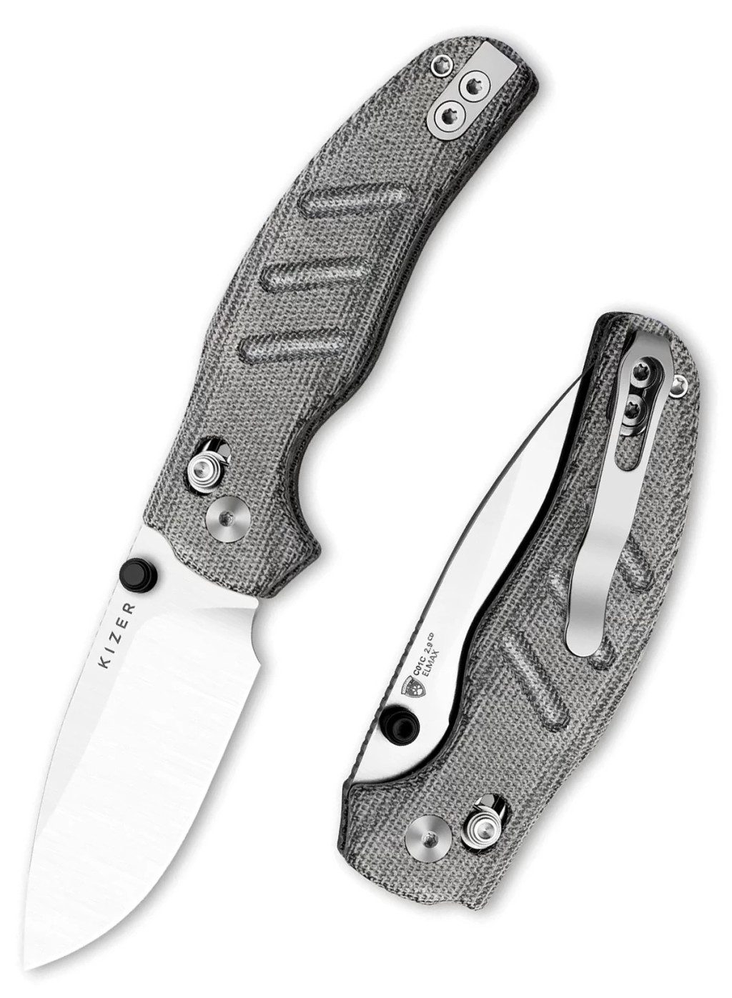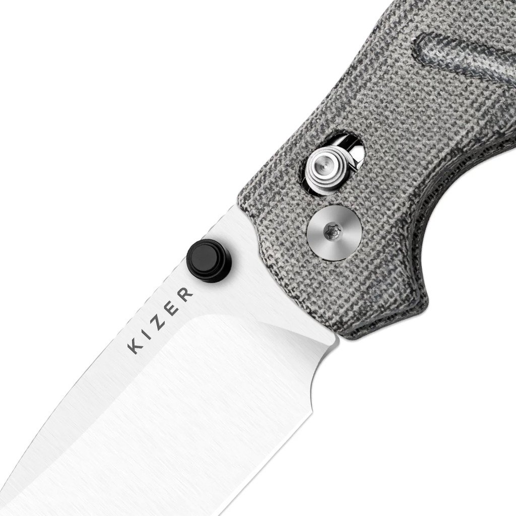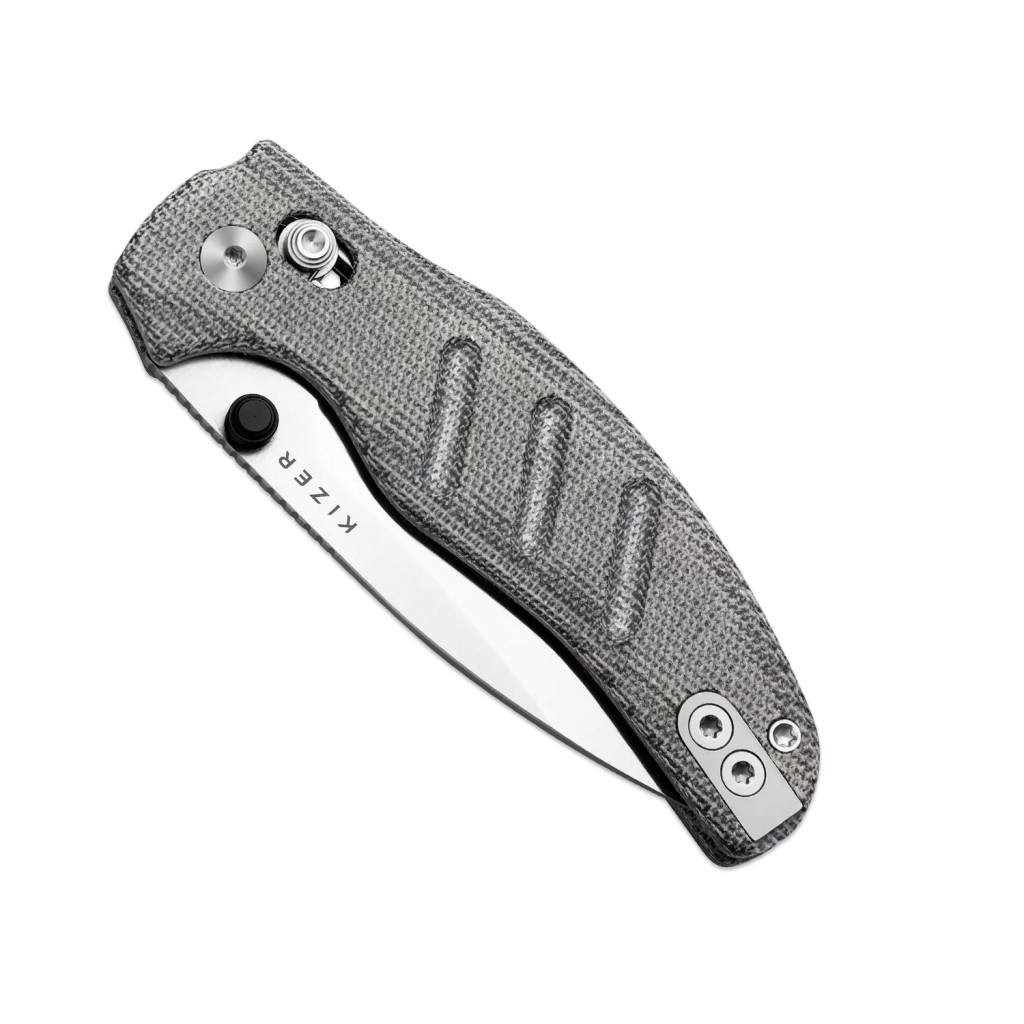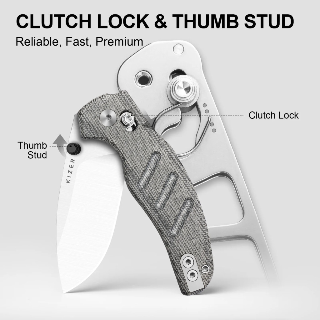 A markolat panelei a prémium minőségű Norplex Ultrex™ Micarta (speciális, nagy szilárdságú vászon-műgyanta kompozit, amely természetes tapintást és kiemelkedő tartósságot biztosít) anyagból készültek, amely nedves vagy saras körülmények között is biztos fogást garantál a felhasználó számára. A kés legfontosabb technikai innovációja a Clutch Lock zárszerkezet (a Kizer saját fejlesztésű, tengelyirányú rugós zárrendszere, amely mindkét oldalról könnyen kezelhető és rendkívül stabil rögzítést biztosít), amely lehetővé teszi a penge villámgyors és biztonságos egykezes kezelését. Az ergonomikus kialakítás és a markolat textúrája hatékonyan megelőzi a kéz elfáradását a hosszabb ideig tartó vágási feladatok során is, szavatolva a biztonságos munkavégzést. A belső szerkezetet alkotó rozsdamentes acél linerek (belső vázlemezek) adják meg a kés robusztus alapját, biztosítva a hosszú élettartamot és a stabilitást a mindennapi igénybevétel során.