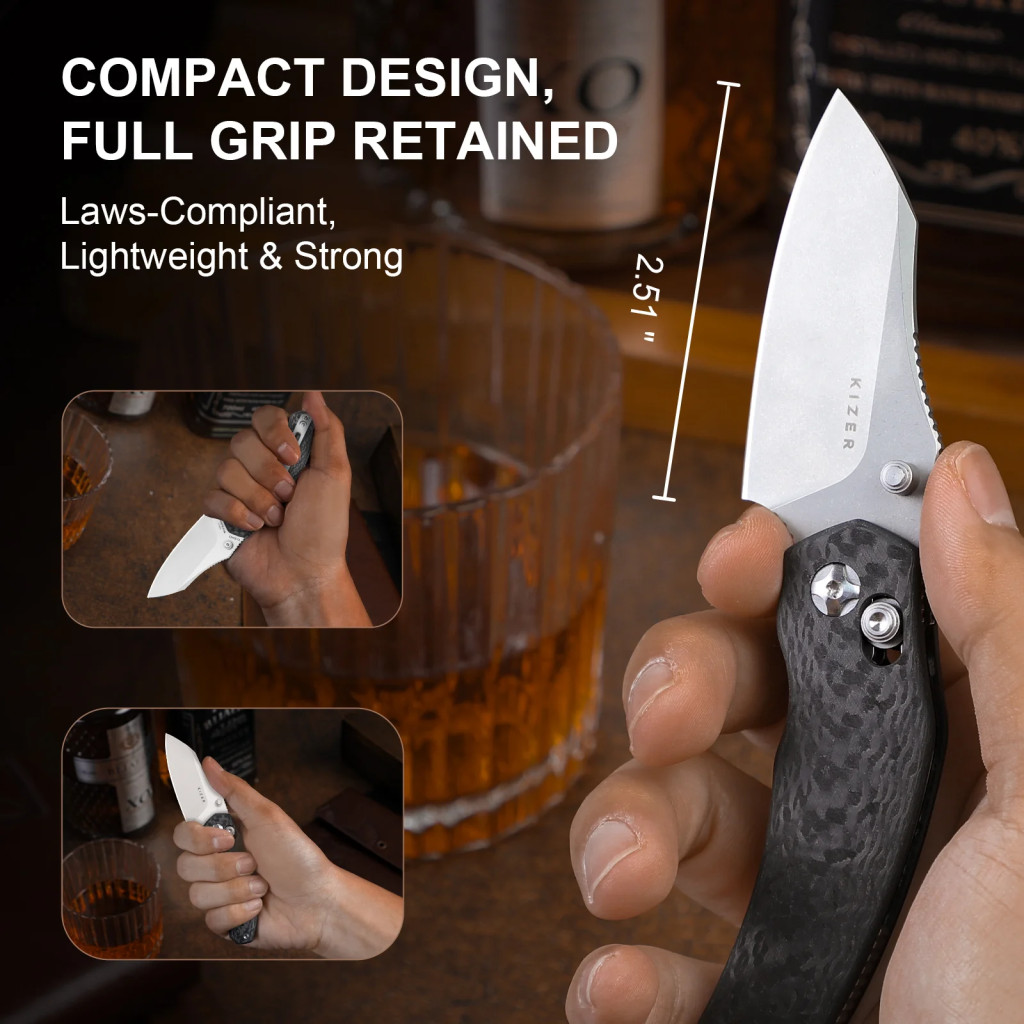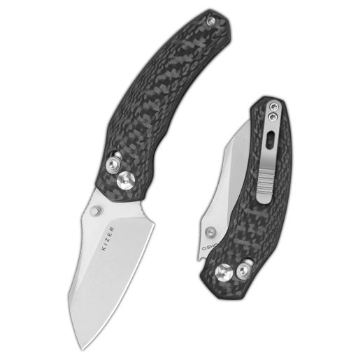 A Kizer Mini Bulldog teljes hossza nyitott állapotban 157 mm, míg zárt állapotban 93 mm. A penge hossza 64 mm, vastagsága 2,8 mm, anyaga CPM-S45VN rozsdamentes porkohászati acél, felülete stonewashed. A penge sheepsfoot kialakítású, amely tompított hegyformája révén biztonságosabb használatot tesz lehetővé. A kés nyitása kétoldalas nyitószemölcs (thumb stud) segítségével történik, zármechanizmusa pedig a Clutch Lock, amely erős és megbízható zárást biztosít. A markolat karbonszálas (carbon fiber), amely egyszerre könnyű és merev, felülete finoman texturált. A modell súlya 72 gramm, zsebklipsze tip-up pozíciójú, és jobb- vagy balkezes hordásra is átszerelhető. A kés Kínában készül, a Kizer gyártási előírásai szerint.