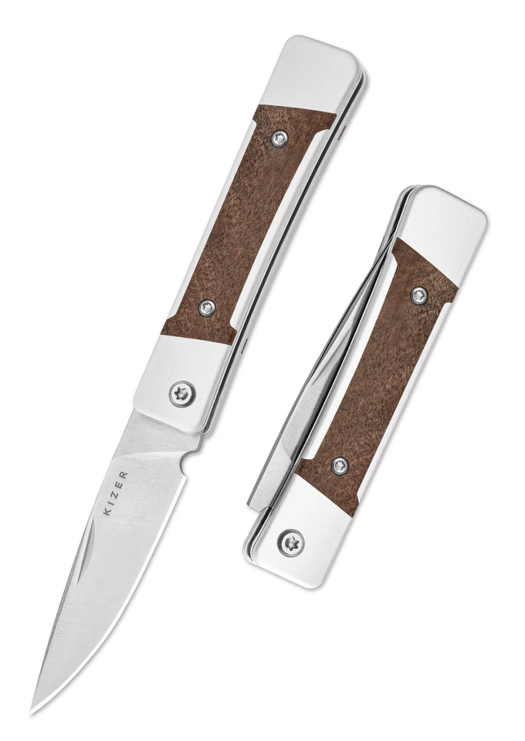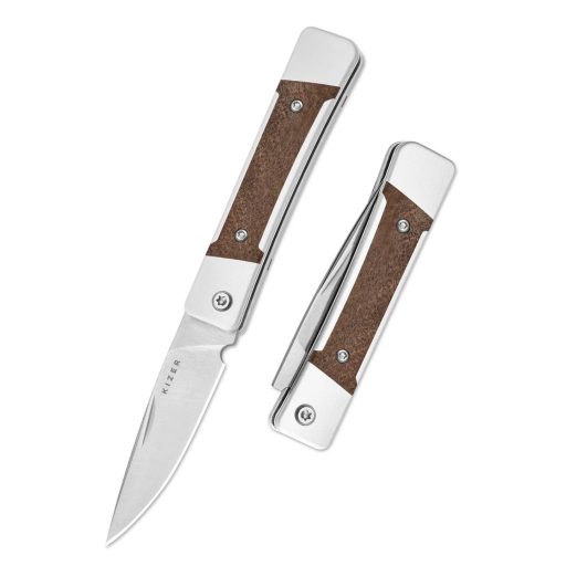 A kés teljes hossza 145 mm, zárt állapotban 81 mm, a penge hossza 64 mm, vastagsága 2,5 mm, acélja Nitro-V, amely a gyártó szerint kiegyensúlyozott él-tartást és stabil vágóteljesítményt biztosít. A penge csiszolása flat grind, ami egyenletes, jól kontrollálható vágóélt eredményez, a drop point forma pedig precíz hegypont-irányítást tesz lehetővé. A markolat anyaga mkuruti wood és alumínium, a markolat hossza 81 mm, amely kompakt, mégis biztos fogást ad. A kés tömege mindössze 51,5 g, így kifejezetten könnyű, zsebben és ingzsebben is kényelmesen hordható. A slip-joint mechanika előnye, hogy finoman mozog, nem igényel erőkart vagy zárkioldót, és megfelel olyan helyzetekben is, ahol a záras kések kevésbé elfogadottak. A konstrukció illesztései pontosak, a penge rugója határozott, a markolat textúrája természetes és ergonomikus — a kés összességében harmonikus, könnyű és használatra kész.