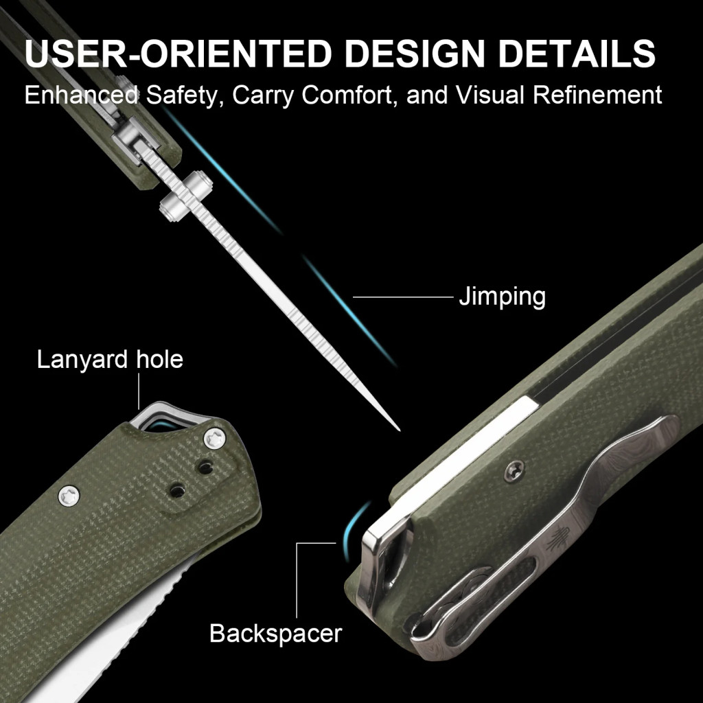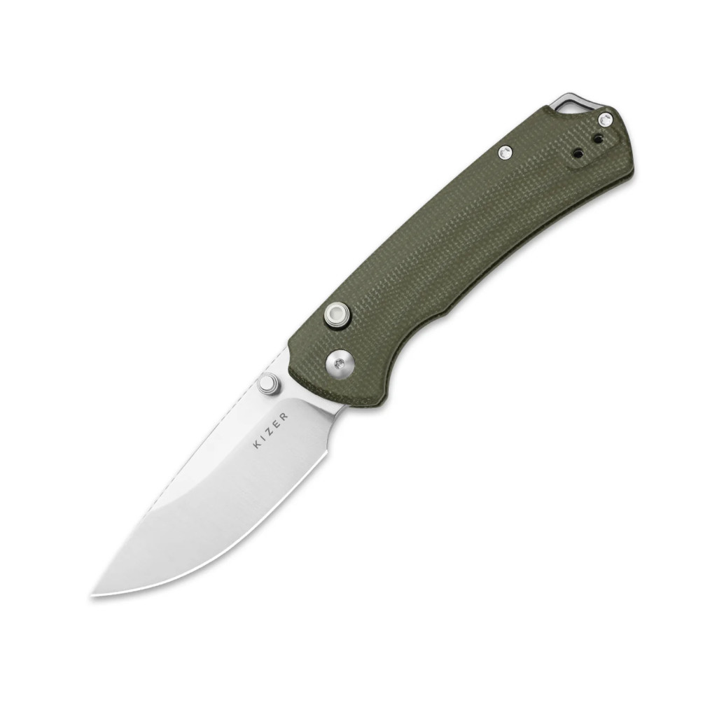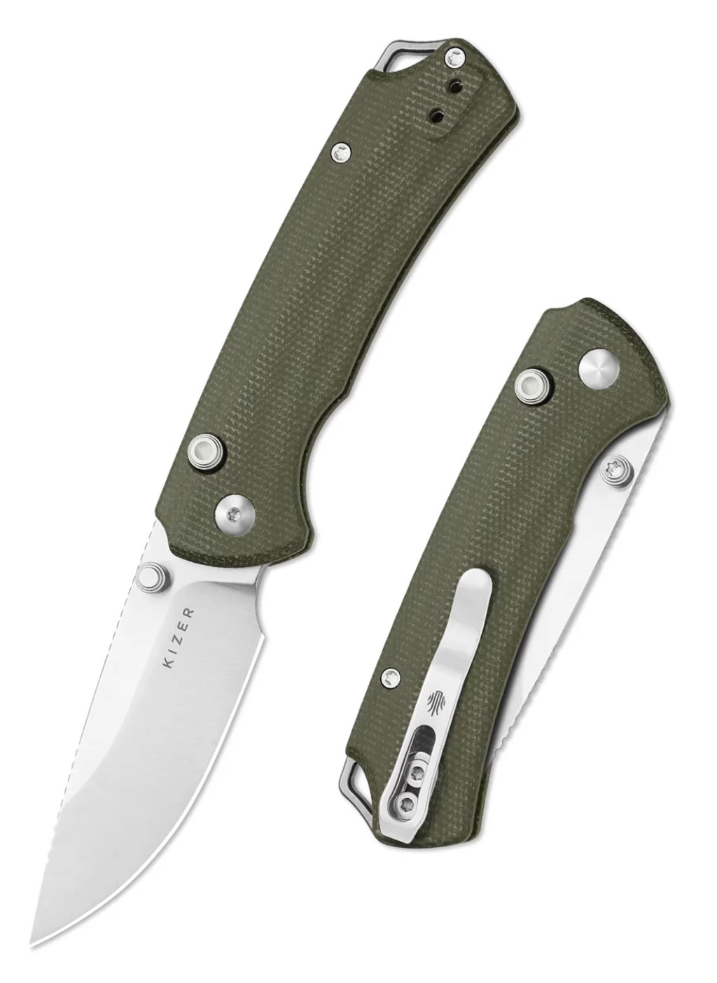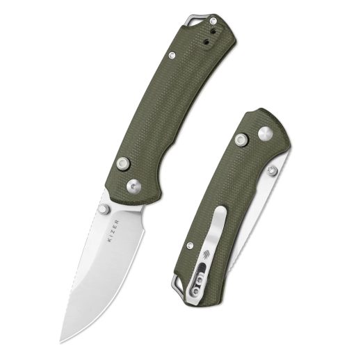 Ez a modell olyan részleteket vonultat fel, amelyek azt mutatják, hogy a Kizer nem csupán anyagminőségben, hanem használhatóságban is kompromisszummentes. A penge anyaga Nitro-V rozsdamentes acél, amely kimagaslóan korrózió- és kopásálló – így nedves vagy párás környezetben is megbízható marad. A penge formája drop-point, azaz enyhén lejtő hegylappal rendelkezik, ami kontrollált vágást és fokozott hegy-stabilitást kínál — sokoldalú felhasználásra is kiváló. A markolat micarta, egy kompozit anyag, amely természetes megjelenést ad és kitűnő fogást biztosít, miközben tömegét tekintve kedvező. A zárszerkezet a „Button Liner Lock”: egy tradícionális liner lock mechanizmus gombos kioldással kiegészítve – ez a kombináció egyszerű, mégis stabil működést eredményez. A klipsz deep-carry, azaz mélyen hordható kialakítású, és reverszibilis jobb- vagy balkezes pozícióval rendelkezik, így a hordás személyre szabható. Az ergonomikus markolat kialakítása, a jimping (a pengén található kis fogazás a gerincen) és a hátvégi lyuk (lanyard-hoz) mind finom részletek, amelyek a viselhetőséget és a használhatóságot javítják.