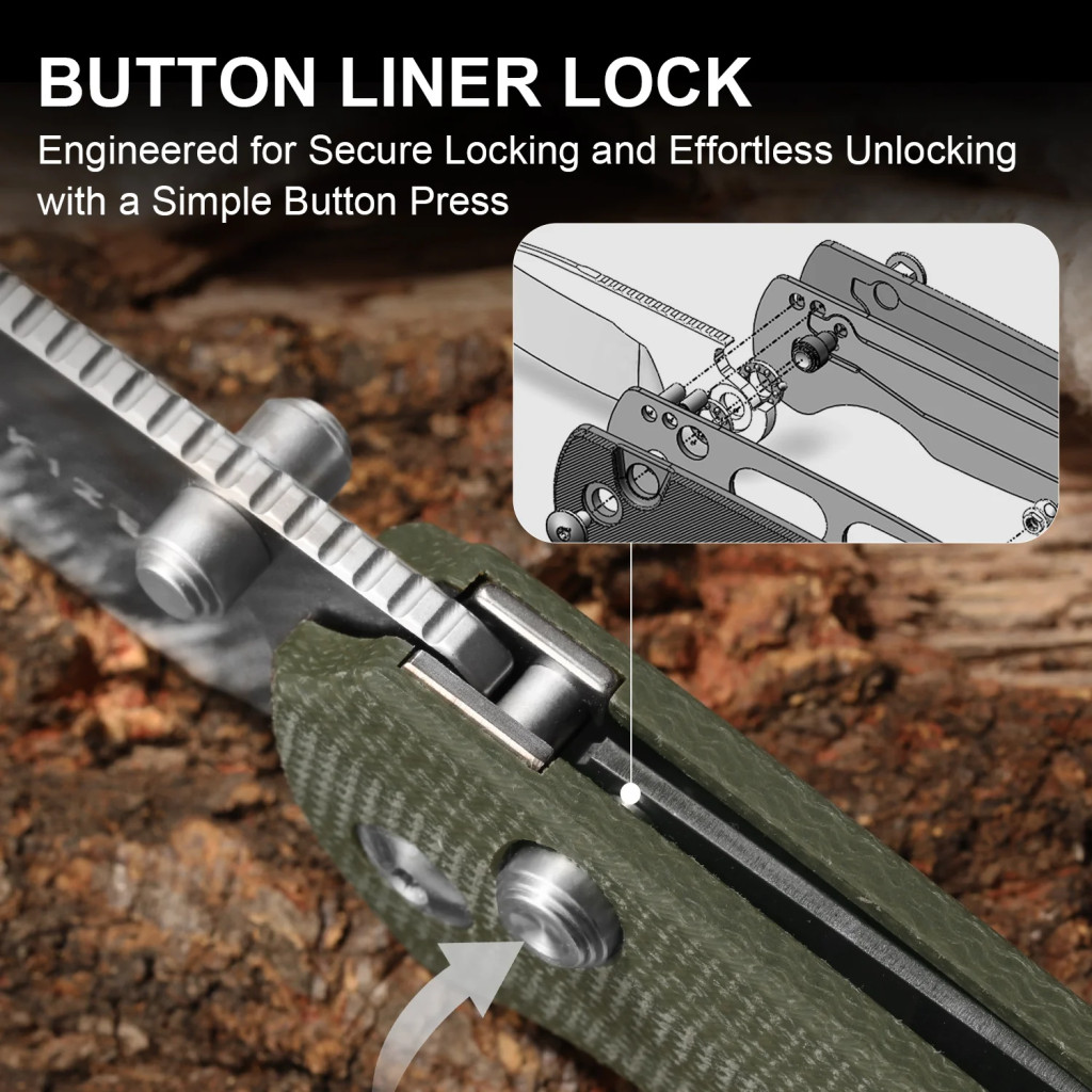 A T1 BD egy olyan zsebkés, amely pontosan a mindennapos hordhatóság és prémium anyaghasználat közötti egyensúlyra törekszik. A markolat micarta anyagból készült, textúrája és színe rusztikus eleganciát sugároz, miközben a penge anyaga — Nitro-V rozsdamentes acél — hosszú távú megbízhatóságot biztosít. A „Button Liner Lock” zárszerkezet a liner lock megbízhatóságát egy modern gombos kioldással ötvözi, így a kés egyszerű használatra és gyors működésre lett tervezve. Elegáns, funkcionális és letisztult – ideális társ mindennapi hordáshoz.