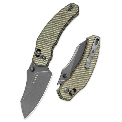 A kés teljes hossza 183 mm, zárt állapotban 108 mm. A penge Nitro‑V rozsdamentes acélból készült, satin felületkezeléssel, sheepsfoot pengeformával, 76 mm hosszúsággal és 2,8 mm vastagsággal. A nyitás thumb stud mechanizmussal történik, a zár pedig clutch lock típusú, amely biztonságos rögzítést és egykezes oldhatóságot kínál. A markolat anyaga micarta, textúrázott felülettel és ergonomikus formával. A mélyre ülő zsebklipsz tip-up pozíciójú, és átszerelhető jobb- vagy balkezes használatra. A kés tömege 98 gramm, gyártása a Kizer kínai üzemében történik, a vállalat saját minőségi követelményei szerint.