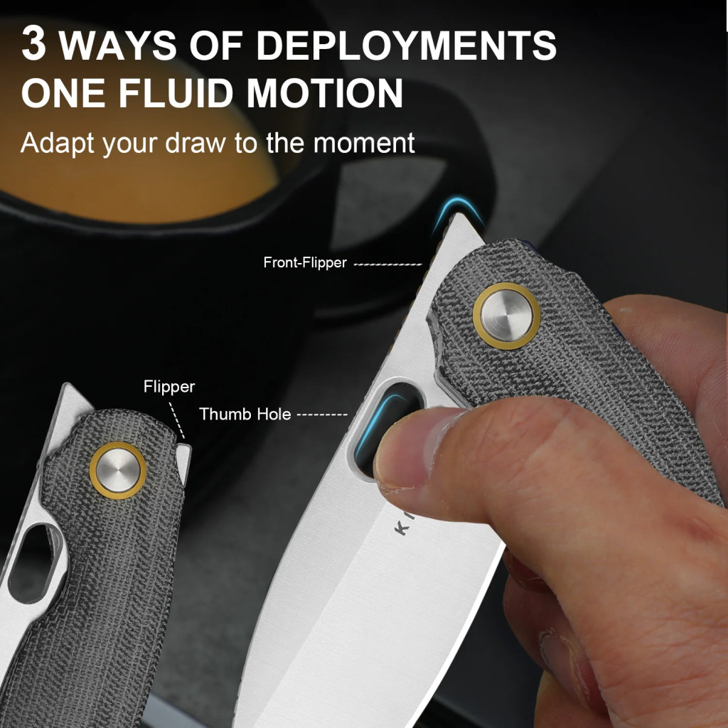 Ebben a modellben részletesen megmutatkozik a prémium kivitel: a penge anyaga 14C28N rozsdamentes acél, amelyet magas szintű élmegtartás és korrózióállóság jellemez, így akár kültéri, akár városi környezetben is megbízhatóan használható. A pengeforma drop point („lecsapott hegyű”) – ez a klasszikus forma stabil hegykialakítást ad, miközben a vágóél végig egyenes vonalban halad, így sokoldalú vágási feladatokra is alkalmassá válik. A köszörülési mód hollow grind (homorú köszörülés): a penge oldalán homorú „medence” alakul ki, mely csökkenti az acél tömegét, így gördülékenyebb vágást tesz lehetővé, miközben az íves profil eloszlatja a vágás közben keletkező stresszt – így kiváló vágási élességet és jó deformációállóságot ad. A markolat anyaga Micarta, amely természetes rostok és gyanta kompozitje – rendkívül tartós, nedvességtől kevésbé érzékeny és biztos fogást nyújt hosszabb használat során is. A kés zárszerkezete liner lock, mely megbízható és gyors működést kínál; a nyitás módjai között megtalálható a front-flipper, hüvelykujj-nyílás és flipper is — így testre szabhatóan használható az adott helyzethez. A hordhatóságot a mélyen hordható (deep carry) zsebcsíptető segíti, amely bal- és jobbkezesek számára is optimális elrendezést kínál (non-reversible).