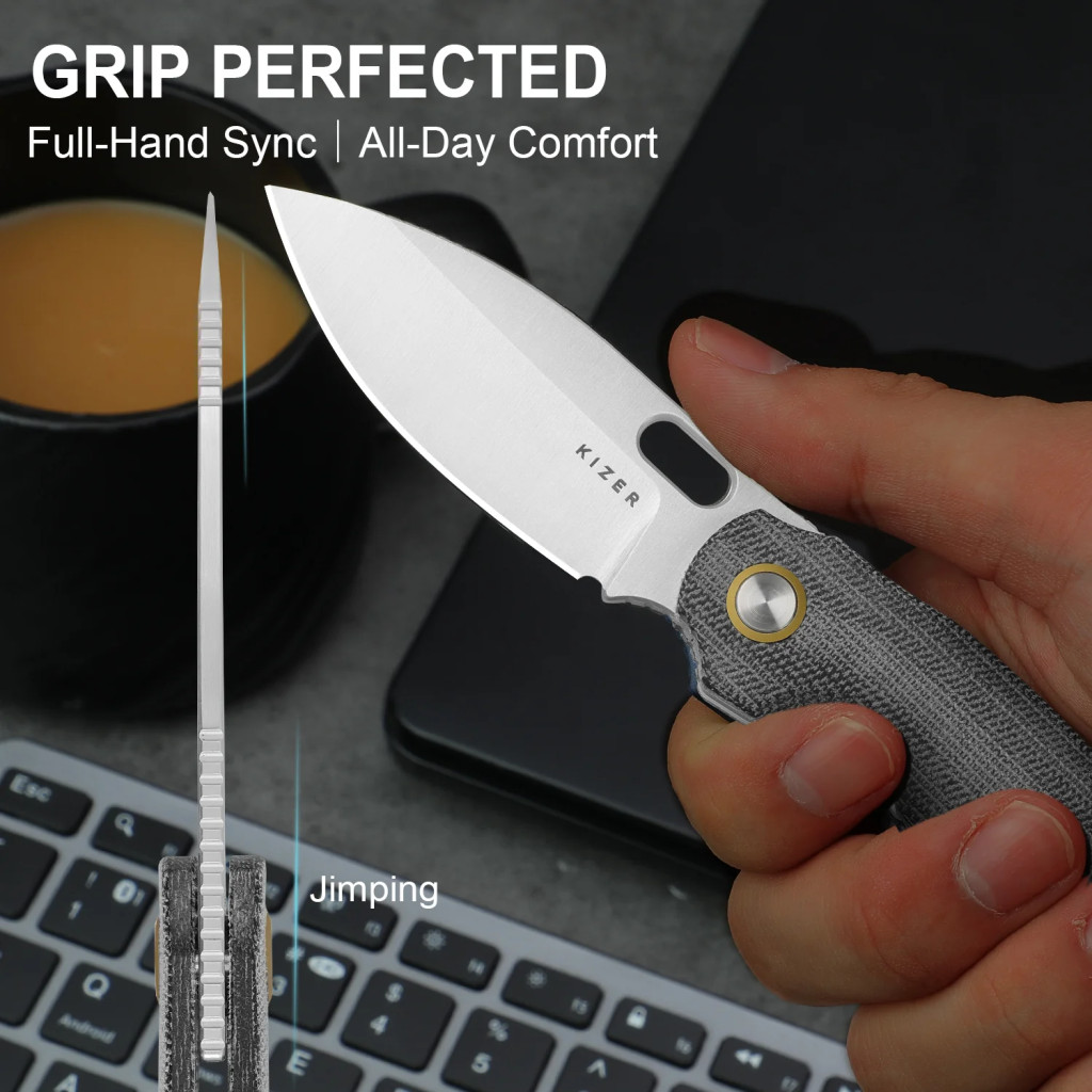 A kés teljes hossza 180,0 mm, a penge hossza 74,9 mm, vastagsága 2,8 mm, a markolat hossza 105,1 mm, és a tömege 79 g. A penge felülete satin finish (selyemfényű polírozás), amely visszafogott fényű megjelenést ad, csökkentve a fényvisszaverődést és javítva a diszkrét kinézetet. A keménysége kb. HRC 58-59, amely az éltartás és az élezhetőség kiegyensúlyozottságát tükrözi. A pengeforma — drop point — olyan kialakítás, amely a hegyrész íveltsége révén stabil és precíz vágóhegyet ad, miközben az élvonal lehetővé teszi sokféle vágási műveletet. A hollow grind köszörülés csökkenti az acél anyagvastagságát az él felé, így gördülékenyebb vágást kínál, míg a Micarta markolat biztos fogást nyújt még nedves vagy hideg környezetben is. A liner lock zármechanizmus stabilan rögzíti a pengét nyitott állapotban — mindez egyetlen kompakt, mindennapi hordásra alkalmas késben testesül meg.