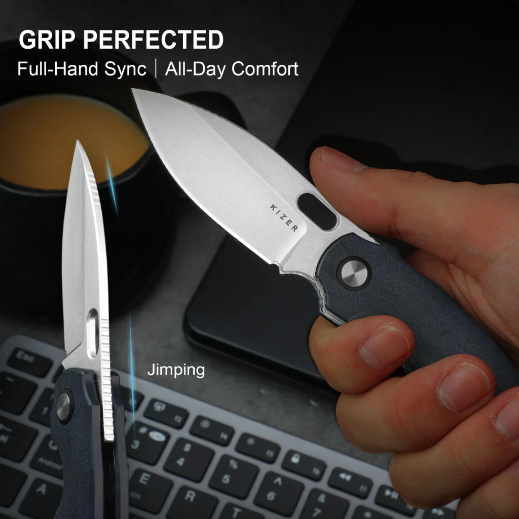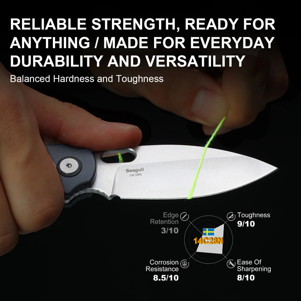 A Kizer Seagull V3770A2 teljes hossza 180 mm, a penge hossza 74,9 mm, a vastagsága 2,8 mm, a markolat hossza 105,1 mm, a súlya pedig mindössze 76,8 g. A penge anyaga 14C28N rozsdamentes acél, amelyet HRC 58–59 keménység jellemez, így az él hosszú távon is megtartja vágóképességét. A penge felületkezelése stonewashed (kőmosott), ami csökkenti a karcolások és ujjlenyomatok láthatóságát, miközben visszafogott, matt megjelenést biztosít. A pengeformája drop point, amely egyaránt alkalmas precíz vágásokra és erősebb metszésekre, a hollow grind (homorú köszörülés) pedig finom vágási karaktert és alacsony vágási ellenállást kínál. A markolat Richlite Blue Canyon kompozitból készült, ami hő- és nedvességálló, kellemes tapintású anyag, hosszú távon is stabil fogást ad. A zármechanizmus liner lock, amely biztonságosan tartja a pengét használat közben, a deep carry zsebcsíptető pedig diszkrét és kényelmes hordást tesz lehetővé, bármilyen ruházaton.