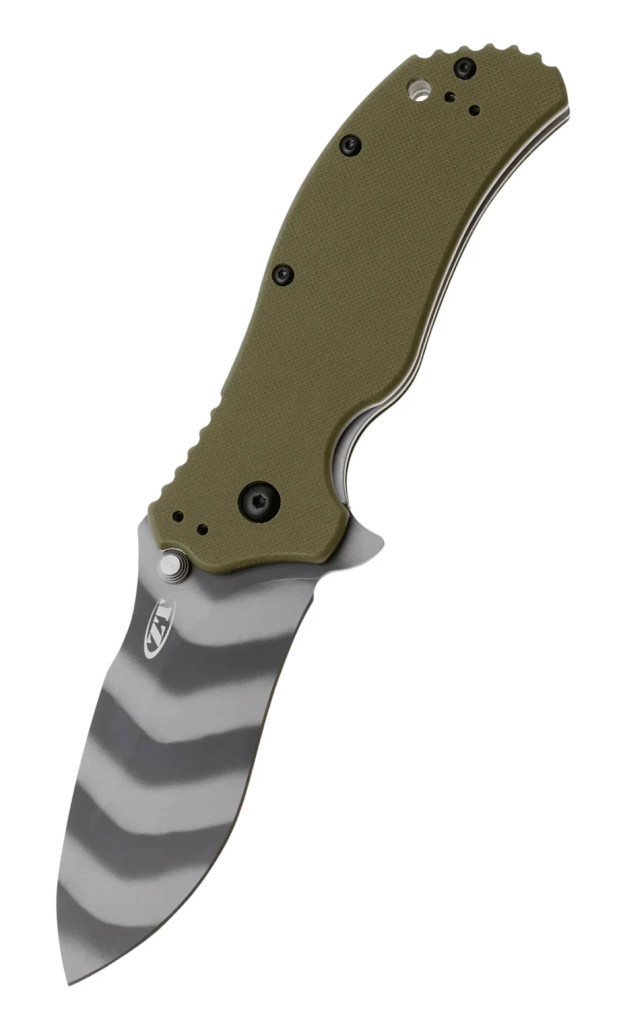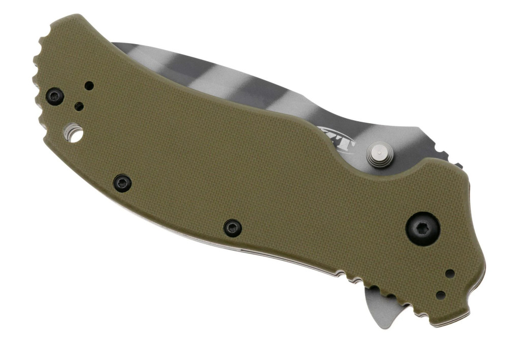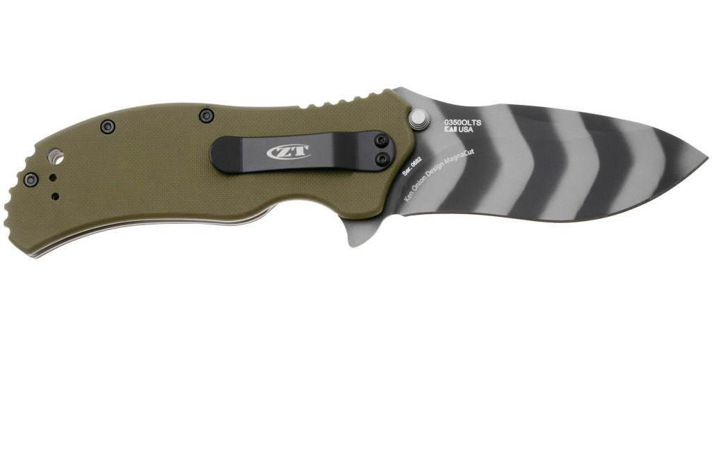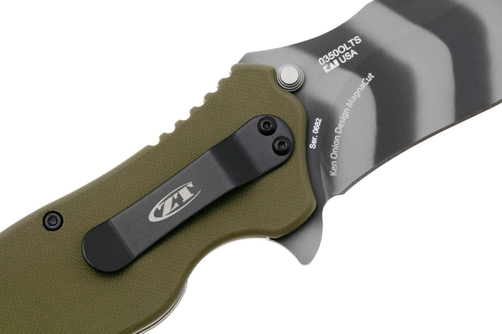 A ZT-0350OLTS pengéje Magnacut acélból készült, amely a legmodernebb porvasasított acélok közé tartozik, kiemelkedő él-tartást, szívósságot és korrózió-ellenállást biztosít — így hosszú távon megőrzi teljesítményét még intenzív használat esetén is. A penge drop point formájú, ami univerzális vágási feladatokra ideális, stabil hegyponttal és erős éllel rendelkezik. A markolat texturált G-10 kompozit, amely kiváló fogást és kontrollt biztosít, még nedves vagy csúszós körülmények között is. A késhez SpeedSafe asszisztált nyitási rendszer tartozik, amely gyors, egykezes nyitást tesz lehetővé flipper vagy hüvelykujj-pecek használatával — még kesztyűben sem okoz nehézséget.